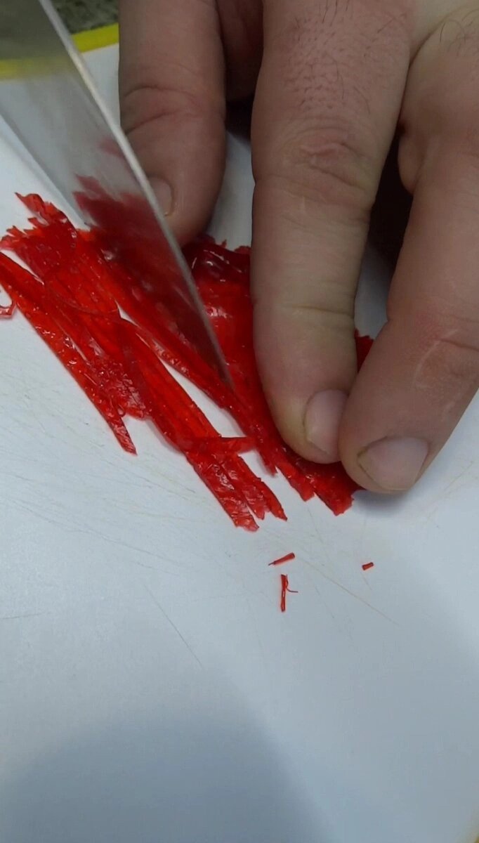 Затем как на фото ниже я нарезал остывшую массу тонкими полосками.