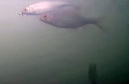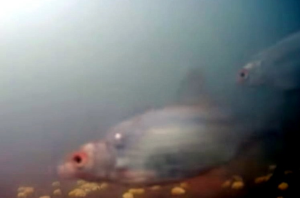 Прикормку немного снесло течением, и я переставил подводную камеру так, чтобы все прикормочное пятно оказалось в поле зрения. Прошло минут двадцать, и к кукурузе подошла плотва.