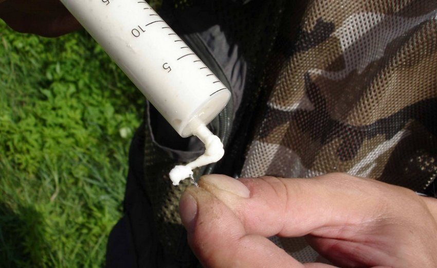 Для удобства насаживания на крючок за ранее приобретаю медицинский шприц в аптеки. Получившуюся болтушку помещаю в шприц. На месте лова очень удобно, выдавливая понемногу наматывать на крючок.