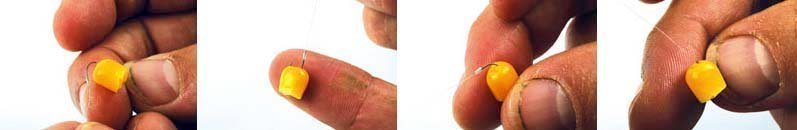 Во всех случаях насаживают таким образом, чтобы жало крючка несколько выглядывало из приманки. Вполне возможно, что рыба может обнаружить вовремя крючок и отпустить наживку, но, как показывает практика, больше рыбы не зацепляется за крючок из-за того, что при подсечке крючок не успевает пронизать зерно кукурузы и рыба успевает выплюнуть крючок с наживкой. В связи с этим, более эффективно – это когда крючок, а точнее его жало, немножко, но выглядывает из зерна.