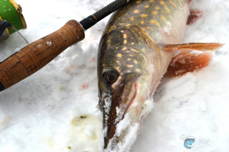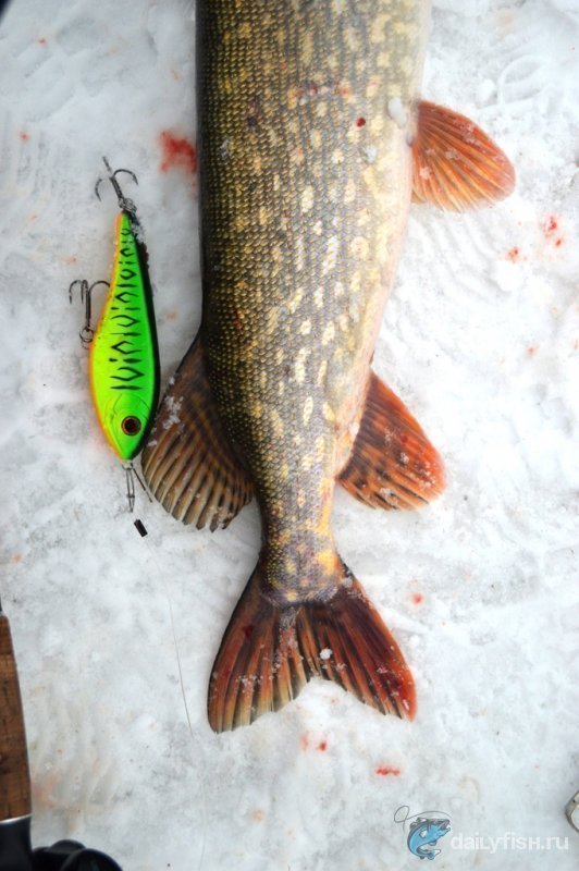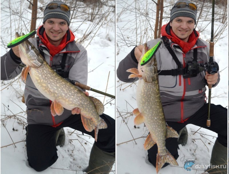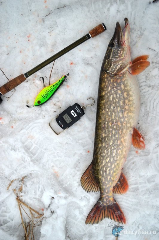 Мы решили раз такое дело, нужно еще раз пройтись по коряжкам. Я снова взял оба комплекта, погонял пару разных джерков, но в итоге решил поставить самую проверенную классику - оригинального Buster Jerk'а в кислоте, что может быть лучше?! Тактика сработала на все 100! Не прошло и пяти минут, как на русле мою проводку кто-то резко остановил и сразу же начал мощно давить вниз, но в руках у меня был "черенок от лопаты" и щука даже не успела понять, что произошло, как уже оказалась на снегу. Это был добротный весенний трофей! Ради такого и весы можно достать, ровно 3,5 килограмма.