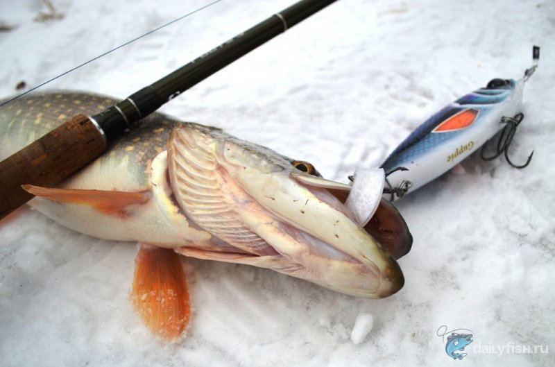 Я решил, что задача минимум выполнена и взял джерковый комплект в руки. На том конце болтался полюбившийся мне по осени Strike Pro Guppie весом каких-то 120 граммов. Я отошел чуть дальше по реке, где у берега торчали коряги, и на первом забросе "наглухо" засадил джерк в одну из них, в подводную их часть... Казалось все, пропало, но намотанный канат оказался прочнее затопленного дерева и приманку удалось сдернуть. Вторая проводка оказалась холостой, а вот третья попала точно в цель. На одном из рывков щука напала на джерк с такой силой и в такой момент, что чуть не выбила спиннинг из рук, шикарно! Вываживание было быстрым и завершилось в мою пользу, ухх...!