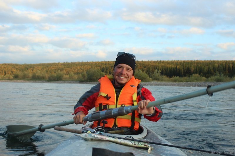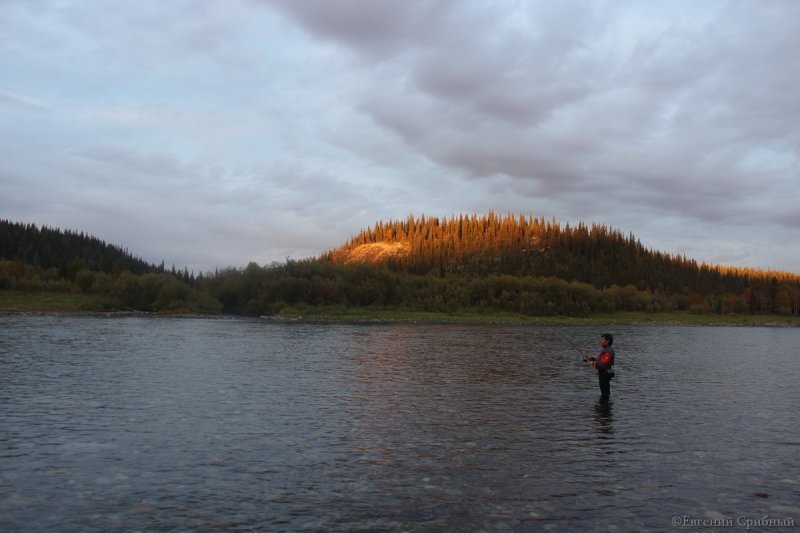 По реке Балбанью мы сплавлялись всего 6 км, но это было серьезное испытание для нашей команды, так как на этом коротком участке сконцентрировано большое количество порогов и сложных шивер. Лето подходило к концу, температура уже начала понижаться, и основная часть рыбы скатилась ниже по течению. Поэтому основную надежду на удачную рыбалку я возлагал на вторую реку Кожим. Она более полноводная, широкая и глубокая. И не зря. У впадения Балбанью в Кожим мы сделали дневку, и тут я уже смог по-настоящему насладиться рыбалкой. Самым клевым местом было непосредственно слияние рек, где в широкое русло почти под прямым углом врезался бурный приток, образуя глубокую яму. Ширина русла в этом месте была метров 30-40.