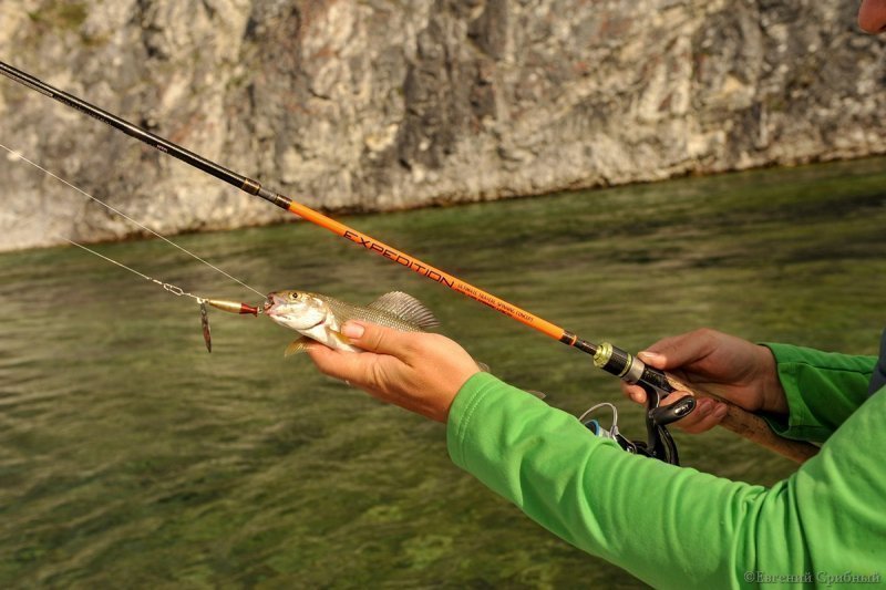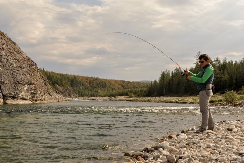 Хариус в основном держится за перекатами и порогами, в таких местах река сужается до 10-25 метров, и тут я пробовал ловить стандартной длинной удилища 210см – без дополнительного колена.