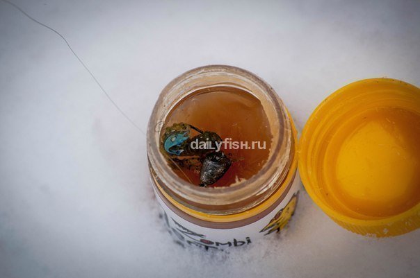 Что ж, похоже время пропитать приманку нектаром. Окунаю в баночку приманку и размазываю нектар пальцем по телу. Хочу заметить, что зимой хранить нектар лучше во внутреннем кармане куртки, в противном случае он будет жесткий и нанести его на приманку будет затруднительно.