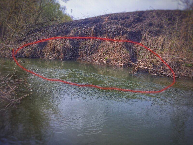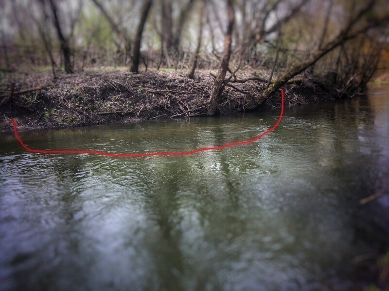 Ловля апрельского голавля привязана к локальным участкам, на которых лобастый базируется в это время года. Для большинства микроречек средней полосы, такими участками являются затишки, граничащие с течением. При этом наличие глубины в этих точках — обязательное условие. Как бы парадоксально это не звучало, но в апреле нам интересны участки с медленным или вовсе отсутствующим течением, небольшие приямки под обрывистым берегом. Эти места легко обнаруживаются по зеркалу реки. Именно на них у вас и произойдёт 90% поклёвок.