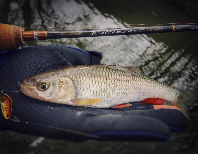 В моих условиях лучшим решением стало ультралайтовое удилище быстрого строя — Graphiteleader Bellezza Correntia 682 UL-TW, которое обладает строгим, при этом податливым бланком и имеет достаточный сдерживающий ресурс, что позволяет при необходимости форсировать вываживание. Изначально спиннинги этой линейки разрабатывались для ловли форели, как в коммерческих водоёмах, так и на течении. Голавля мы ловим в очень похожих условиях, поэтому альтернативной специализацией Bellezza Correntia можно считать ловлю белых хищников. Удилище позволяет выполнить максимально точный и уверенный кистевой или маятниковый заброс приманки в рамках тестового диапазона. Это как раз то, что нужно на небольшой речушке в стесненных условиях.