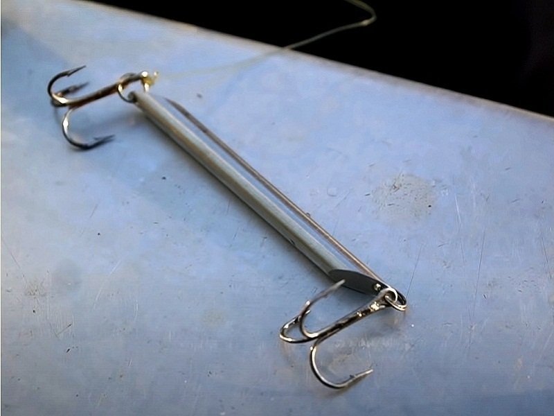 Что представляет собой приманка? Это может быть пруток или массивная трубка из светлого нержавеющего металла со срезанными наискосок концами, где крепятся тройники, сверху и снизу, как на зимних донных блёснах. Такая конструкция приманки позволяет надёжно засечь хищника, который хватает возящуюся в донном иле блесну. Передний её тройник доступен только в момент отрыва приманки от дна. Поэтому блесна и оснащается двумя тройниками.