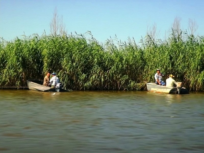 Между тем наиболее результативной глубиной для ловли судака местные жители Нижней Волги считают здесь 2-2,5 метра, а уловистыми точками являются небольшие заливчики в зарослях высокого берегового камыша. Здесь обычно стоят на якорях лодки местных жителей, ловящих хищников на «тыркалку». Понятно, речь идёт не о русле Волги, а об её дельте, которая представляет собой сеть не очень широких проток и ериков, обрамлённых камышом. И именно на такой, казалось бы, смехотворной для гордого судака глубине попадаются нередко трофейные «клыкастые». Кроме судака добычей может стать матёрый сазан, крупный окунь, даже сом, тоже обычно обитающий в ямах. Почему эти рыбы так резко изменили свои размашистые привычки на мелкие плебейские? Очевидно, всё дело в том, что протоки дельты Волги пронизывает до дна яркое солнце, течение, как в трубе, сильное и непрерывное, мест для укрытия и засад нет. А под высоким камышом находится тень, что для жаркой Астрахани и прочих мест в округе — это поистине благодать, как для рыбаков, так и для их потенциальной добычи. Кроме того, здесь течение уже не такое стремительное, как в стрежне проток, а скорее вихревое и нередко обратное, что является отличными условиями для обитания и охоты хищников, поскольку и мелкая рыбёшка охотно держится в таких местах. Кроме тени и ослабленного течения для уклеек и плотвичек здесь просто бесплатный ресторан. На стеблях и в корнях камыша водится множество насекомых и личинок. Только открой рот… Поэтому лодки местных рыбаков стоят прямо под камышом, на якорных растяжках поперёк течения. Глубина в 2-3,5 метра здесь сразу начинается от условного берега. Сам же твёрдый берег где-то там, за джунглями камышей.