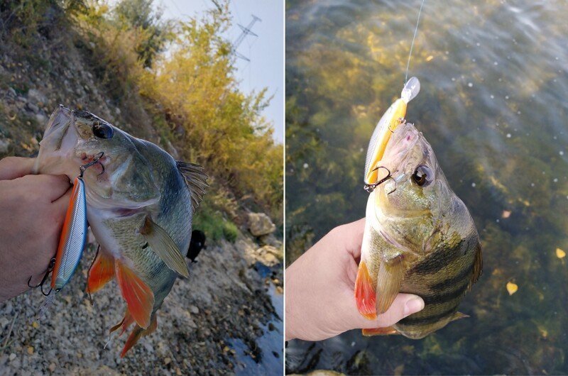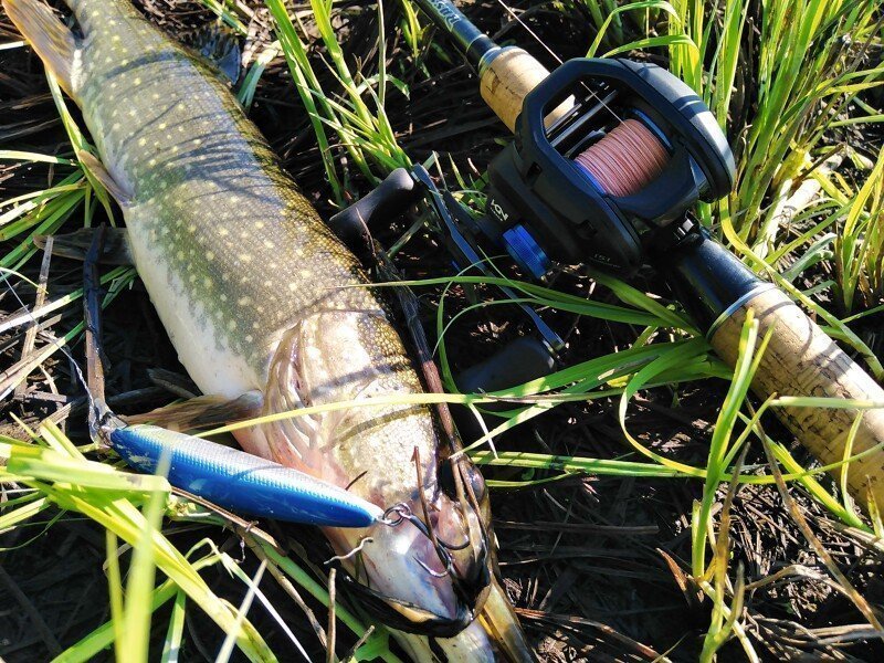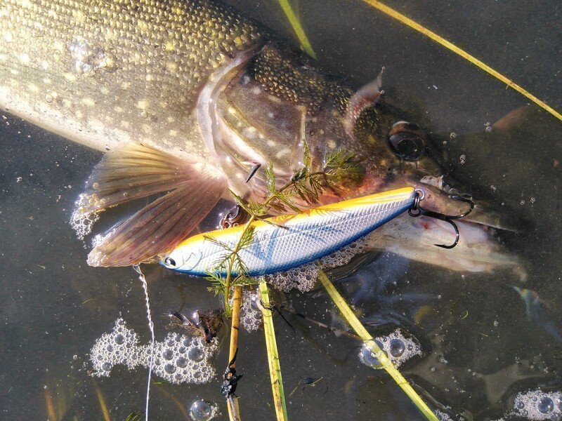Щука. Тут, на самом деле, всё более чем просто. Если место было выбрано верно, и Вы всё сделали правильно, то никакой слишком сложной проводки тут и вовсе не нужно. Зубастая с уверенностью отзывалась на классический твичинг, а бывало что и вовсе получалось доловить на самую обычную равномерку. Что действительно удивило — это возможность использования Silver Shiner даже на заросших мелководных «жабовниках» по доступным для заброса карманам. Чтобы удержать максимально мелководный горизонт, кончик удилища стоит держать в вертикальном положении и производить рывки с амплитудой вверх. Воблер, в данном случае, совершает не слишком широкие рывки, тем не менее передвигаясь по акватории достаточно активно — что предсказуемо просто не может не нравится щуке.