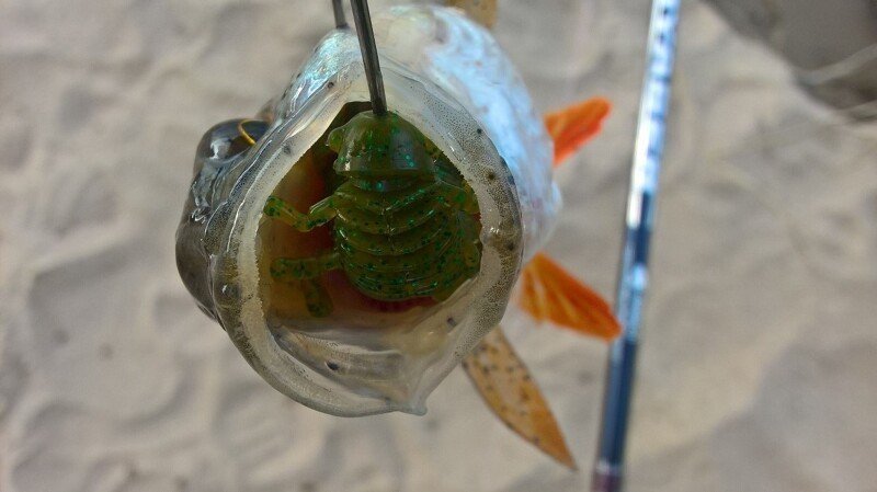 Если те 8 лапок, что расположены по бокам приманки, имеют скорее декоративное предназначение, то основным элементом в игре являются самые крупные, чем-то похожие на своеобразную клешню или даже крыло, расположенные в задней части, и по отношению к основному туловищу имеющие примерно сопоставимый размер. Практически к концу основания, на них имеется дополнительное поперечное ребро, которое выполняет основную задумку создателей приманки, и «заводит» Insector фактически с пол оборота катушки. Даже больше: данные крылья начинают по-настоящему включаться в работу при самом лёгком движении кончиком удилища — всё зависит от того какую проводку Вы планируете использовать и какую по активности рыбу ловить. Бывало и так, что двигаясь совершенно хаотично приманка провоцировала хищника гораздо лучше, чем на стандартной ступеньке.