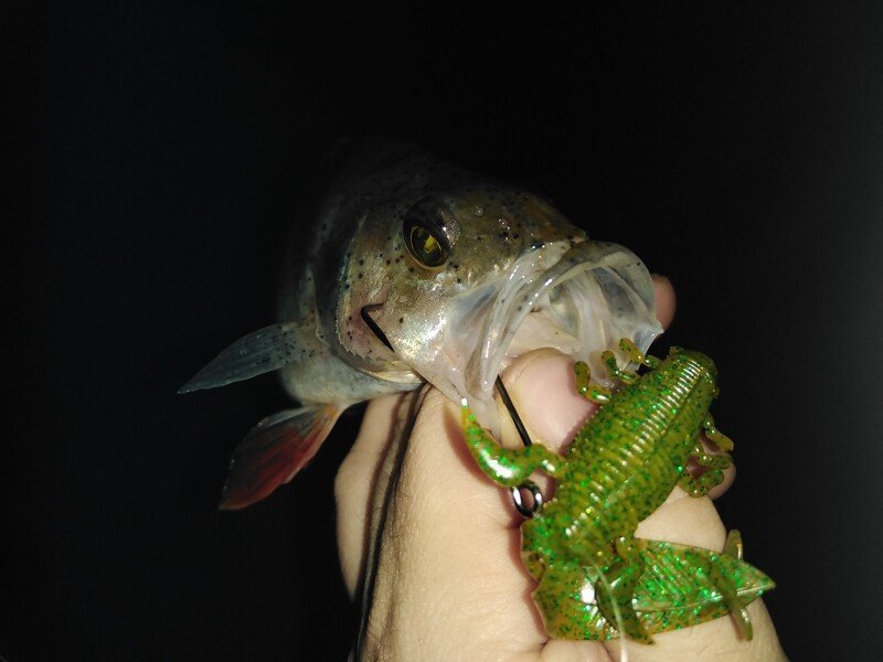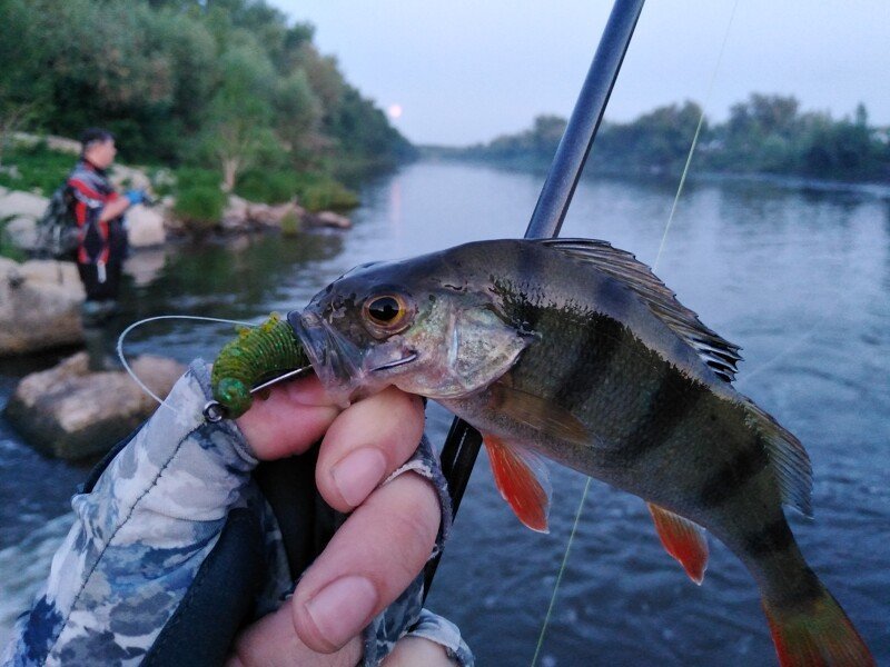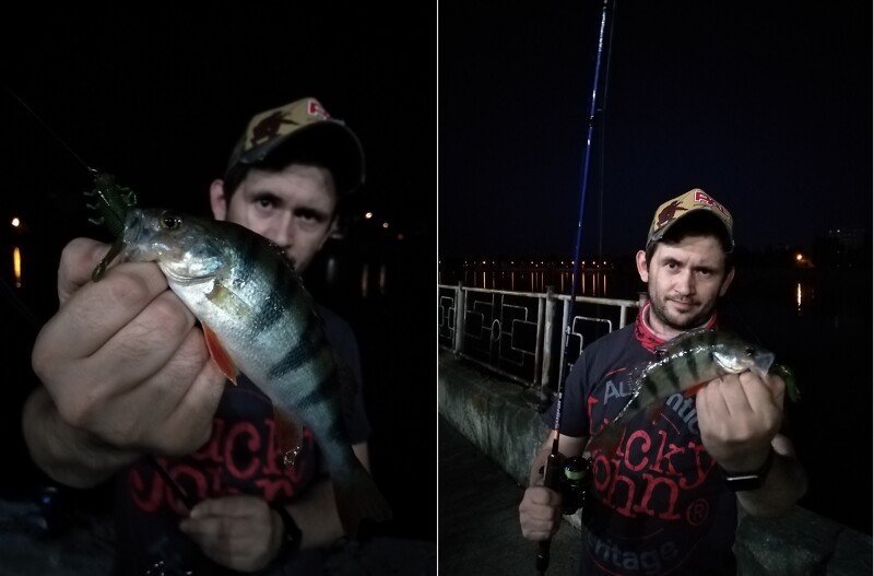 Да, и в целом как выяснилось с Insector никакой специальной «сверхмудрённой» проводки и не нужно придумывать — приманка отлично включается в работу и приносит свои плоды на самых типичных «два крутка — пауза — два крутка», с одной лишь разницей, что пауза требуется более долгого характера, в следствии геометрии тела. И, к моему огромному удивлению, «кракозябра» работает ещё и ночью: Городская судаковая точка, самые первые минуты наступившей темноты и неожиданная ответная реакция... Окуня. И, когда казалось, что это банальная случайность и это был единственный кому ничего не досталось на ужин, тут же следовала ещё одна поклёвка, и разбойник с лёгкостью доставался на берег для фотографии. Случайность? Да, как бы не так! Городские фонари прекрасно освещающие часть водоёма, давали отличную возможность не только для охоты ночных спиннингистов решивших скоротать лишний часок перед сном на водоёме, но и провоцировали хищников оставаться в тонусе на протяжении всего дня, чем умело и пользовались знающие рыболовы.