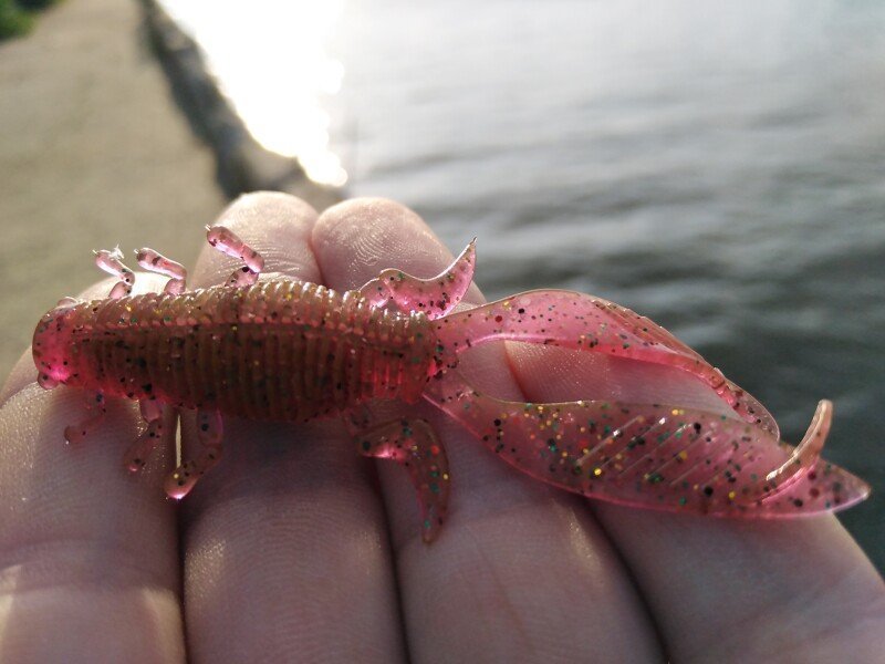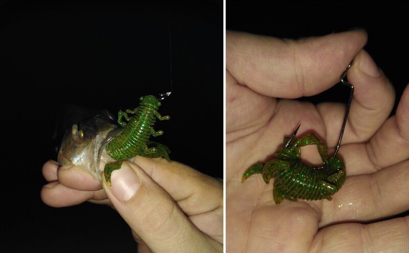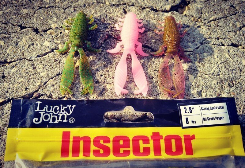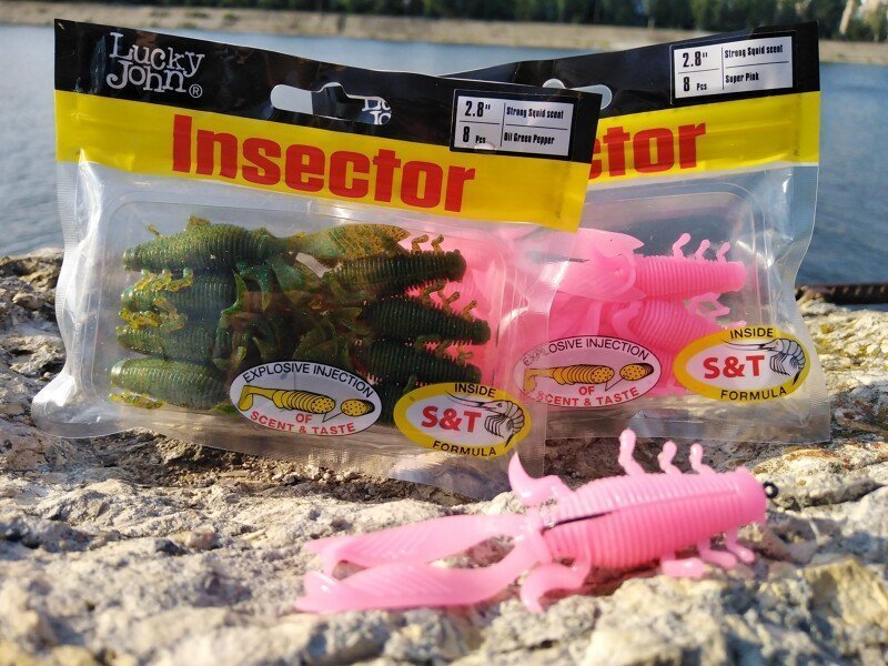 Выпускается Insector на данную минуту в единственном размере в 2,8 дюйма и в 10-ти вполне стандартных и востребованных расцветках. В пачке, Вы найдёте 8 приманок, и этого как считаю, вполне достаточно, чтобы познакомиться с новинкой сполна. Единственный момент, который хочется уточнить сразу — это нежелательное использование двойного крючка. Нет, он прекрасно подходит по форме тела, но зачастую уже при забросе, крылья так и норовят залезть под жало, что в буквально смысле лишает приманку игры и заставляет делать повторный заброс. Идеальный вариант — это офсетный крючок, а в каком варианте оснастки решать только Вам. В моём случае «кракозябра» показала себя отлично и на стандартном шарнире, и на поводковых оснастках, идеально провоцируя не только окуня, но и щуку с заветным судаком