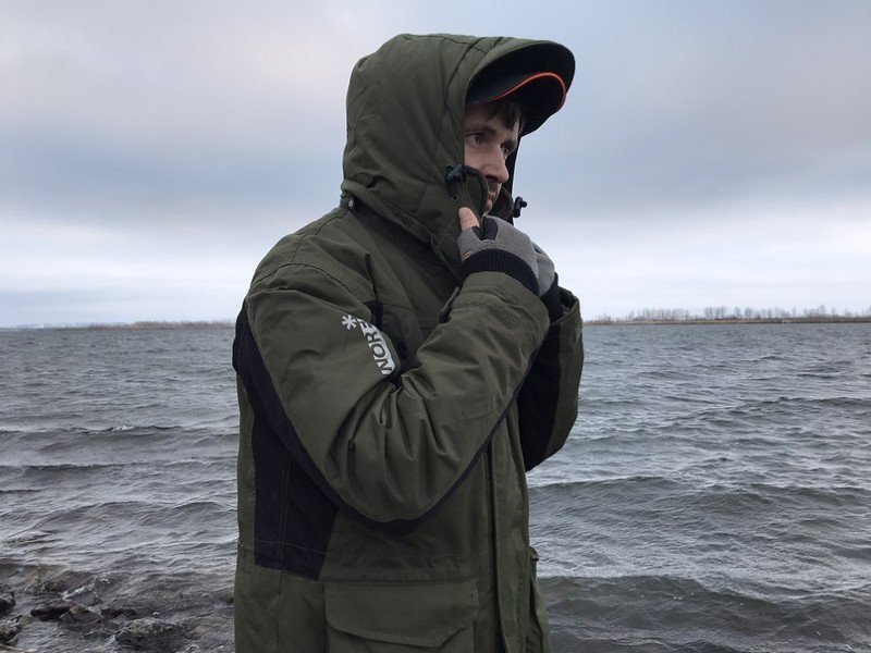 На куртке имеются 7 карманов, 6 из которых внешние, и один внутренний. Два кармана на груди оснащены влагозащитными молниями и прекрасно подходят как для согрева рук, так и для различных мелочей, но сказать честно, лично я ими не воспользовался ни разу. А вот двойные боковые карманы на липучках и вовсе стали одним из самых востребованных элементов во всём костюме — идеально подходят как для хранения перчаток, так и для небольшой коробки с приманками, тем более когда не хочется носить с собой весь арсенал, что имеется у Вас. Основное предназначение внутреннего, на мой взгляд, это хранение телефона/смартфона — карман имеет флисовую подкладку и застёжку на молнии, что практически гарантирует сохранность вашего «девайса» от самых разных неожиданностей. Так же, куртка имеет достаточно высокий воротник, который поможет укрыться от ветра, и капюшон, который при первой необходимости можно отстегнуть, если того потребует ситуация.