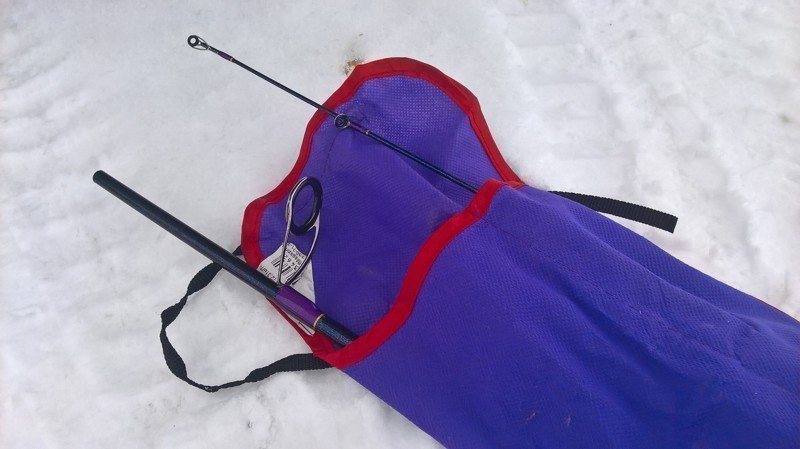 Чехол. Как говорится «гостей встречают по одёжке», а спиннинг по обложке. Но не стоит ждать чего-то невообразимого — чехол тут самый обыкновенный, тряпочный, со всей необходимой информацией на лицевой стороне. Секции, что немаловажно, разделённые — самый главный момент, что цена «домика для спиннинга» не влияет на его стоимость, и это уже безусловно плюс. Тем, кто особо придирчив, советую сразу задуматься о приобретении тубуса, так как с «дури», можно испортить всё, что угодно. У меня же к примеру, после прошествии сезона зимнего спиннинга, чехол поживает очень даже отлично.