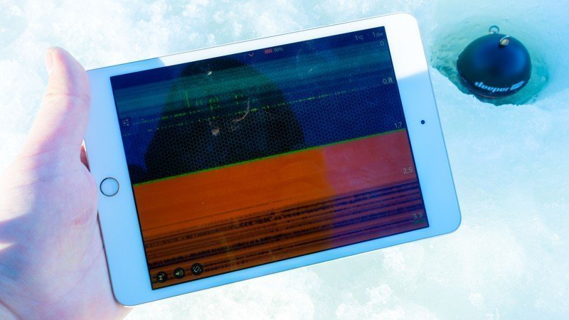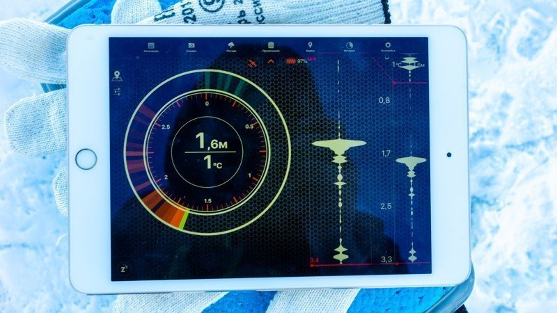Что ж, набор открыт, теперь попробуем подключиться и увидеть первые показания моего нового прибора. Сверлю несколько лунок, опускаю шарик на воду и подключаюсь к нему по Wi-Fi. Для более наглядного примера я взял с собой iPad mini, экран которого отчетливо продемонстрирует все фишки приложения.