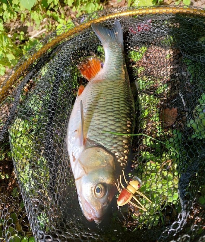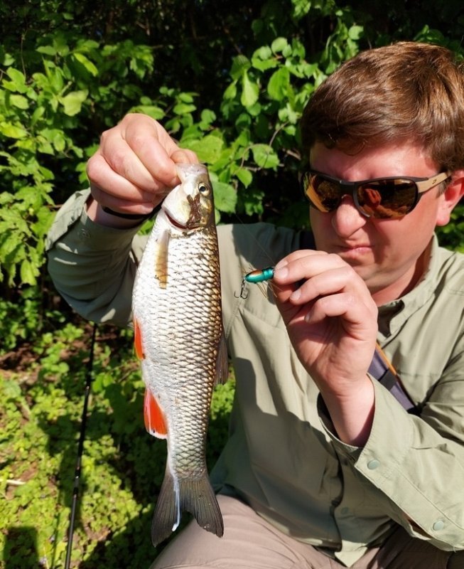 Возвращаюсь, а сам все продолжаю смотреть на воду — привычка влезла в подкорку…. И тут, на полпути, случилось чудо чудное: я увидел крохотного голавлика, и уже из вредности и безысходности, решил подкинуть ему жучилу… Голавлик заинтересовался и начал крутиться вокруг моего зеленого Gemibug как юла! М-м-да, сразу видно, что ведет он себя словно рыбье дите неразумное, коим он, в принципе, и является. Крутился он, крутился, да возьми и цапни тройник, дурашка…