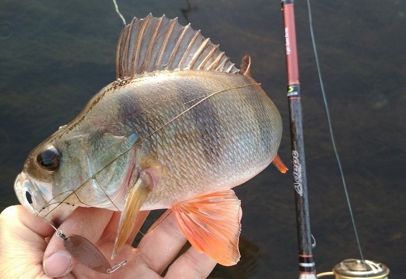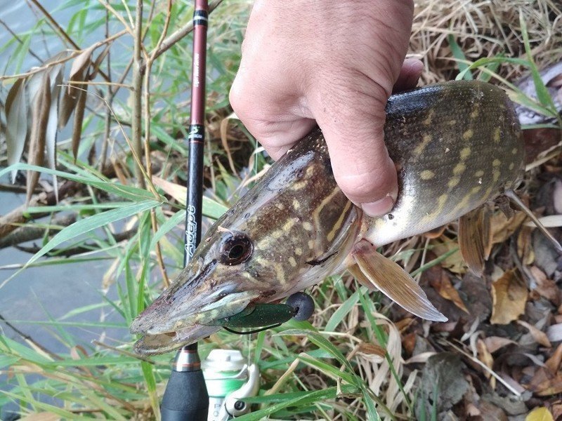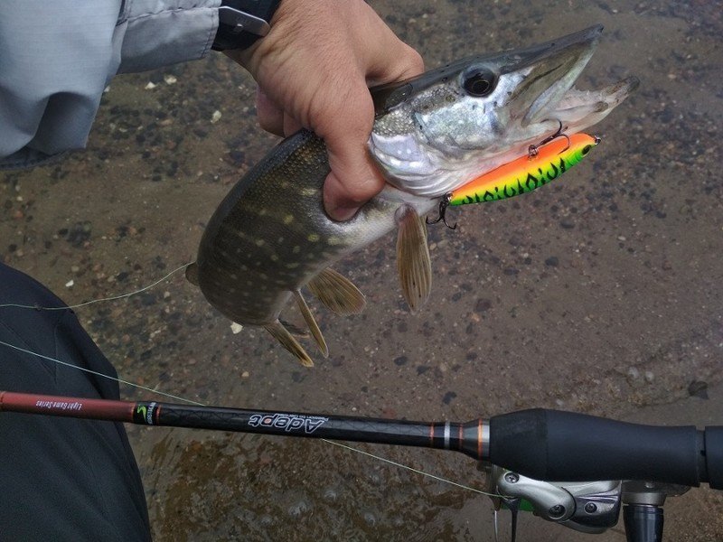 Нужно было проверить пригодность удилища в работе с воблерами минноу, «железом» и топвотерами. Я не беру в расчет равномерные проводки, речь сейчас исключительно о специфических приманках, требующих особых техник проводки. Начнем с самой спорной из обозначенных выше — «железа». Само собой, я имел в виду не привычные колебалки (хотя и их тоже), а небольшие (6-12 граммов) пилькеры, которыми нужно максимально далеко бросаться и искать рыбу в толще воды, вплоть до придонной ловли. На этот случай у меня была пригоршня реплик известных пилькеров Hayabusa и Renegade Iron Minnow. Их не жалко отрывать, ими можно джиговать, их легко и недорого восстановить. В основном на «Адепте» стояла безынерционная катушка Shimano Twin Power 2500S со шнуром Egi-metal от YGK. Максимально далеко получалось забрасывать восьмиграммовый пилькер и так же свободно анимировать его резкими подрывами и потяжками. С пилькерами весом 10-12 граммов уже все было не так просто. Дело в том, что желанная мною «живая» вершинка уже не позволяла в полной мере поддернуть железку ото дна. Заброс же по верхней границе теста вызывал меньший дискомфорт, чем при джиговой ловле «железом», но некие опасения за сохранность снасти были, поэтому хлесткие забросы я не производил.