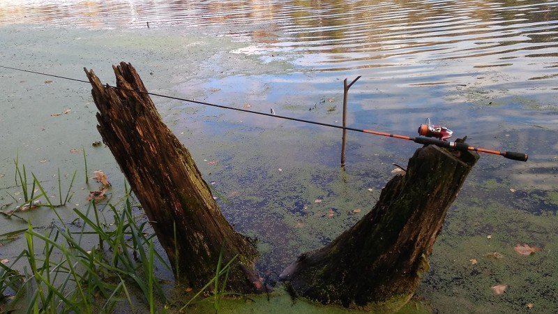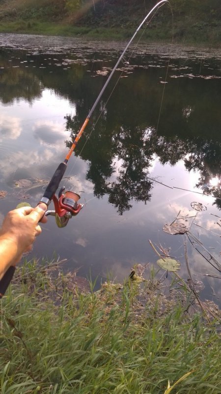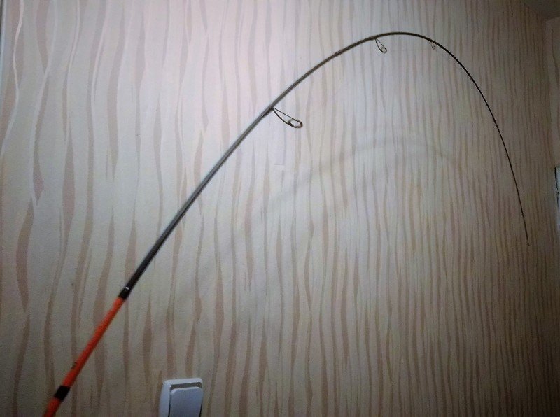 И первое фото демонстрирует, когда клюёт некрупная рыба, грамм до трёхсот весом. Важное замечание — вываживание проходит на чистой воде, в активную работу включается только его верхняя часть, примерно — треть, как у спиннинга быстрого строя.