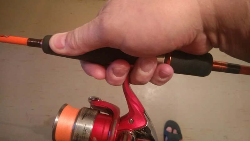 Для тех, кто привык, чтобы указательный палец, при ловле, находился непосредственно на бланке, небольшим разочарованием будет тот факт, что на спиннинге Evolution SEV-213UL этого сделать не получится, палец может лечь только на форгрип.
