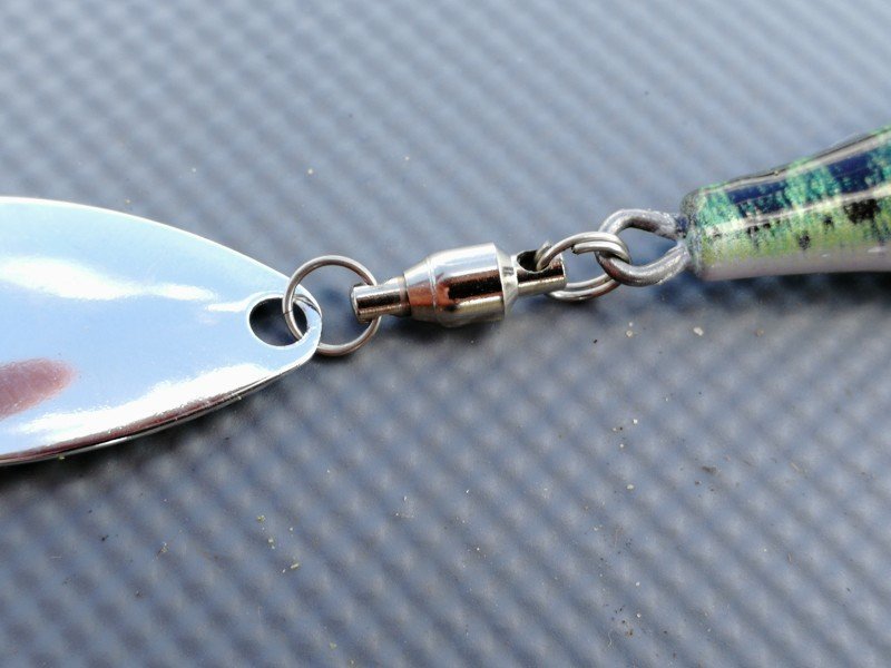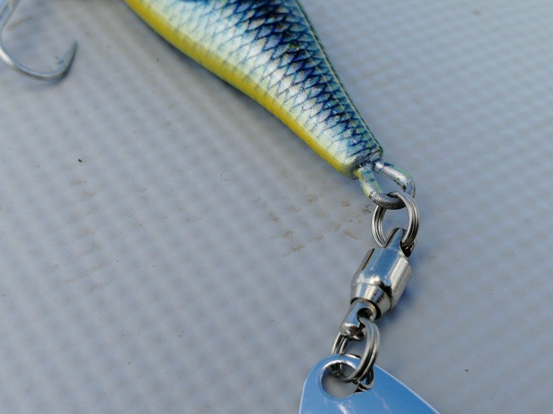 К телу приманки он крепится через вертлюжок, имеющий, как я понял шариковый тип и выполненный на высочайшем уровне. От его работы зависит очень многое, и на нем глупо было бы экономить производителю. Вся система дополнена двумя заводными кольцами, которые, так же как и сам вертлюжок выполнены в светлых тонах.