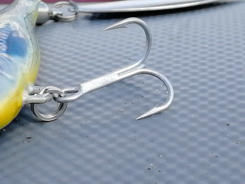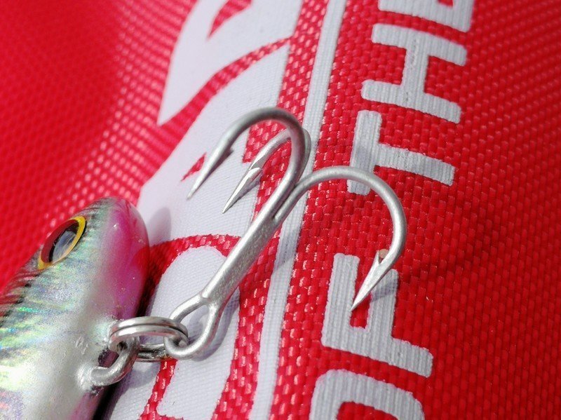 Приманка снабжена одним пропаянным тройником не очень крупного размера. Сам крючок имеет матовое противокоррозионное покрытие, чаще встречающееся на крючках для морских приманок. Назвать крючок тонким нельзя, но благодаря достойной заточке и оптимальному углу бородок, крючок легко просекает пасть хищника и почти не дает сходов.