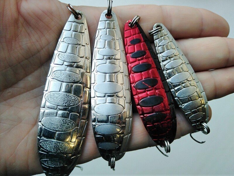 В каталоге данного производителя имеется девять расцветок и четыре типоразмера данной блесны с каждой из которых мне посчастливилось познакомиться. Веса в 14, 18, 22 и 26 грамма соответствуют размеру в 59, 67, 77 и 86 миллиметров соответственно. Выполнена в классической форме ивового лепестка с изогнутым профилем ближе к хвостовой» части. Почему же «Croco»? Скорее всего потому, что внешняя сторона блесны выполнена в рельефной форме, и нанесённый на неё рисунок очень напоминает крокодиловую кожу. Качество покраски действительно хорошее, но продольные полоски нанесённой на поверхность краски, уж очень не любят контакта с щучьими зубами. Однако само исполнение покрытия сделано с идеальной точностью. Края абсолютно ровные и аккуратные, и не вызывают ни малейшего сомнения.