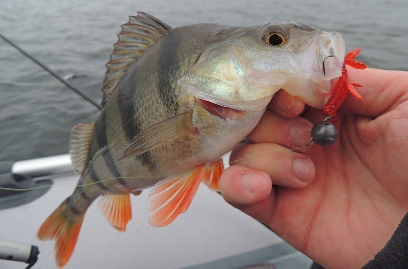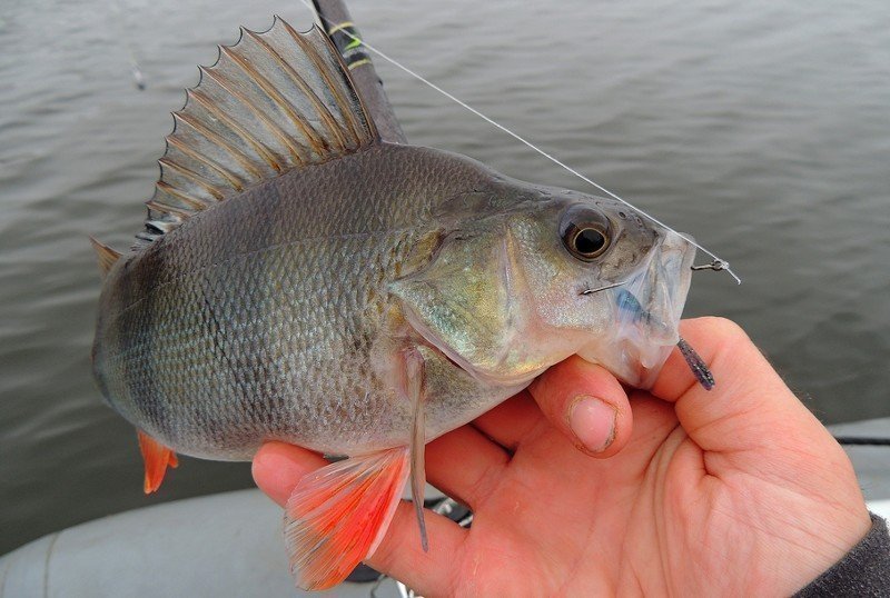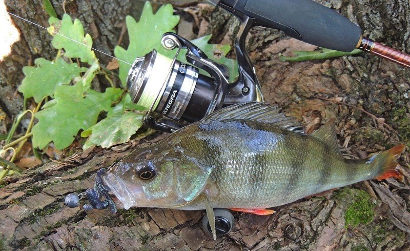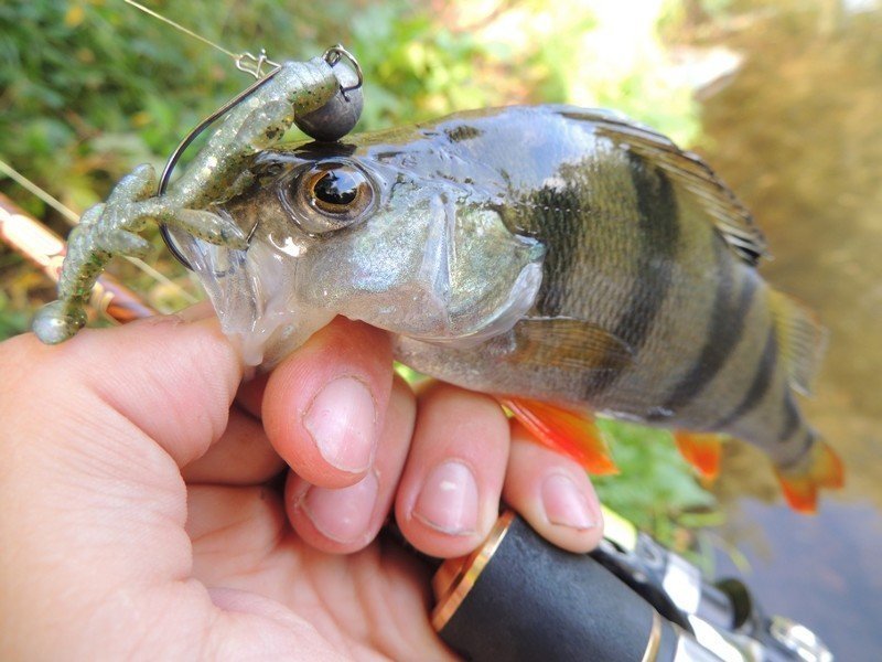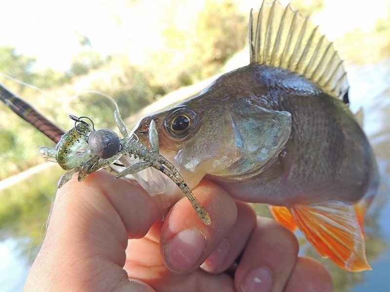 Особенно понравилось ловить окуня в небольшом омутке малой реки. Он стоял под стенкой камыша, где глубина едва превышала метровую отметку. 2 грамма + офсетный крючок подошли под эти условия самым подобающим образом. Поклевки случались даже в момент свободного падения приманки после заброса, когда она тонула и перебирала своими боковыми конечностями.
