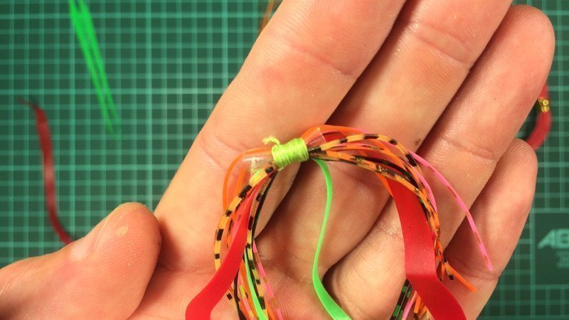 1-2 хвоста и 4-6 нитки вполне достаточно для одной приманки. Вяжутся они на ПВХ трубочке, внутренний диаметр её подбирается под кевларовый шнур, борода не должна опуститься ниже узла на поводке крючков.