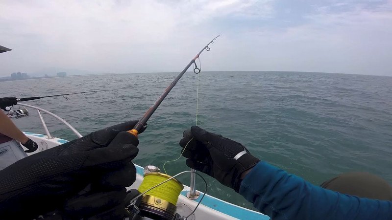 Это «лодочная» приманка для отвестной ловли на глубинах от 40 метров. Используется короткое удилище, я выбрал не жёсткое, с тестом до 90грамм, длиной 6’6″. Я использую шнур PE #5, но это довольно толстый шнур. Флюрокарбоновый поводок длиной 1-2 метра #12 привязываю узлом PR. Заброса как такового нет, приманка просто отпускается у борта. Если течения нет, то можно и забросить. Проводка нехитрая, я открываю душку, стравливая шнур и придерживая его пальцами.