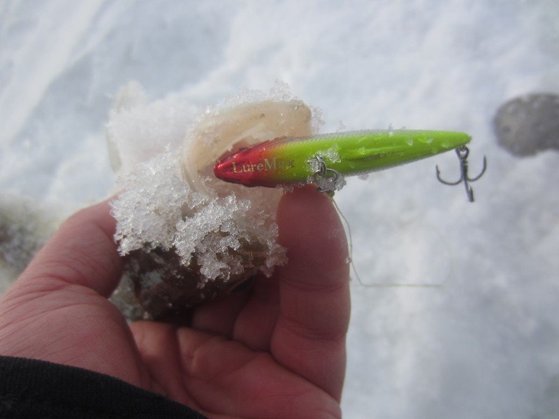 Никаких испытаний в ванной не проводилось. Все эти описания «как он виляет боками и падает в ванной» не применимы и не будут соответствовать суровой зимней реальности. Поэтому — из рыбацкой коробки сразу в бой! Глубина ловли — от 5 до 7 метров, в мутной воде при наличии слабого течения. Приманка ставилась на разные удильники и рыба попадалсь на этот раттлин и на монолеске 0,28-0,3 мм и на флюрокарбоне 0,25 мм. Какой-то разницы в игре не заметил, т. е. приманка равноценно вибрирует на подъёме. Но когда ловишь с более толстой леской, я заметил, что на сбросе после взмаха приманка чуть притормаживается и падает плавней. На фото с судаками — раттлин стоял на леске 0,3.