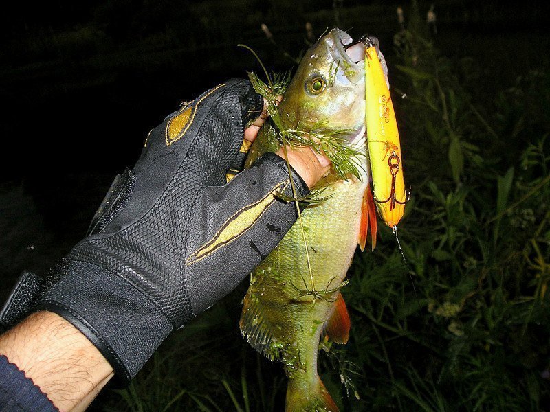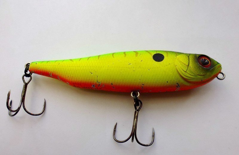 Kosadaka Glide 90, прежде всего, несомненно, предназначен для ловли щуки на мелководных участках водоёмов, оттого от острых зубов бесстрашной хозяйки рек и озёр ему приходится несладко. Лучше всего, по моему мнению, противостоят повреждениям воблеры с матовой окраской. На ней остаются следы от многочисленных укусов и царапины, но покрытие не продолжает сползать дальше. В принципе, это не так уж и важно, но с эстетической точки зрения очень хочется, чтобы мои любимцы имели презентабельный вид как можно дольше. Расцветки волкеров я предпочитаю яркие, заметные — это помогает контролировать проводку и их местонахождение даже при ряби на поверхности воды и пасмурной погоде. Несмотря на «взрослый», полноценно щучий размер приманки, довольно часто ей интересуется окунь, как я уже ранее говорил, причём даже и не самого крупного размера. И всё же целенаправленно ловить «матросов» на Глайда я бы не рекомендовал, для этого лучше выбрать, допустим, его младшего брата Kosadaka Glide 70, но это уже будет совсем другая история.