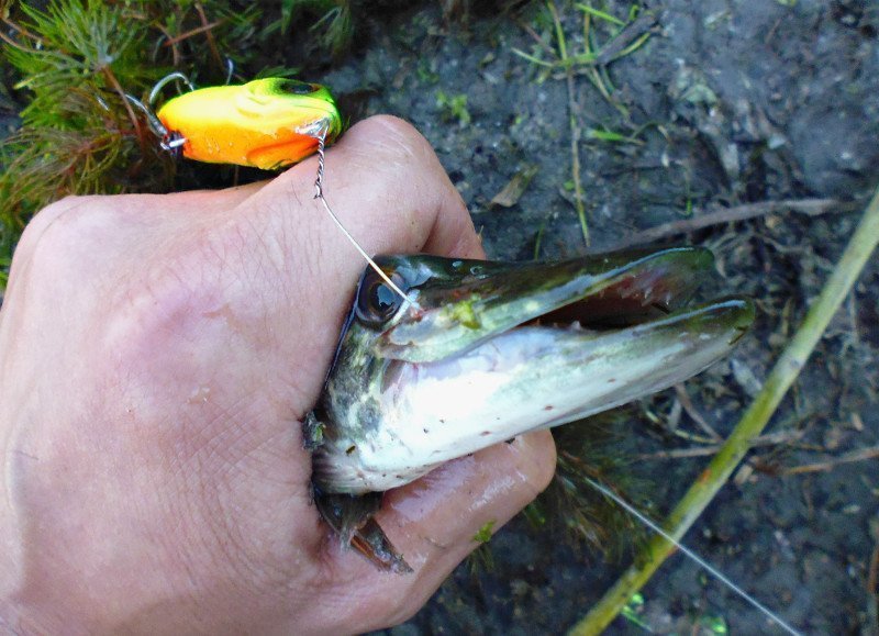 Частой причиной холостых поклёвок является чрезмерно быстрая реакция рыболова на всплеск возле приманки. Атака хищника ещё только началась, а спиннингист уже инстинктивно сделал подсечку, выдернув добычу из пасти решившего пообедать обитателя пучины. Нелегко выдержать паузу, особенно когда видишь внезапно возникший бурун на поверхности воды, но это необходимо. Если сразу не чувствуется сопротивление на другом конце снасти, то я ожидаю пару секунд и, если приманка не всплыла и не оказалась вновь в моём поле зрения, подсекаю. Если нет уверенности в том, что это был выход щуки, а не окуня, то подсечка производится без излишнего фанатизма, так как слабые губы «полосатого» почти со стопроцентной вероятностью не выдержат сильного рывка. Ну, а если всё же попалась щука, то острые тройники, скорее всего, отлично выполнят свою работу сами.