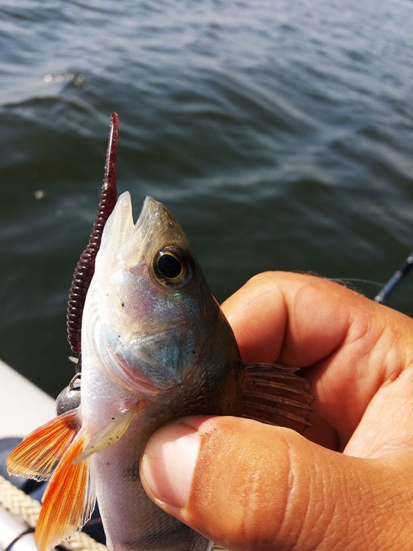 Малый размер i Shad Tail у меня ловил в основном окуня, причем зачастую не отсекая мелочь. Иногда на него также вешались напильники-судачки и шнурье.