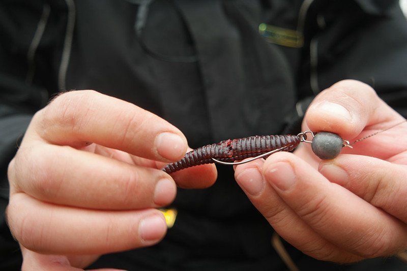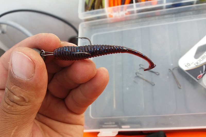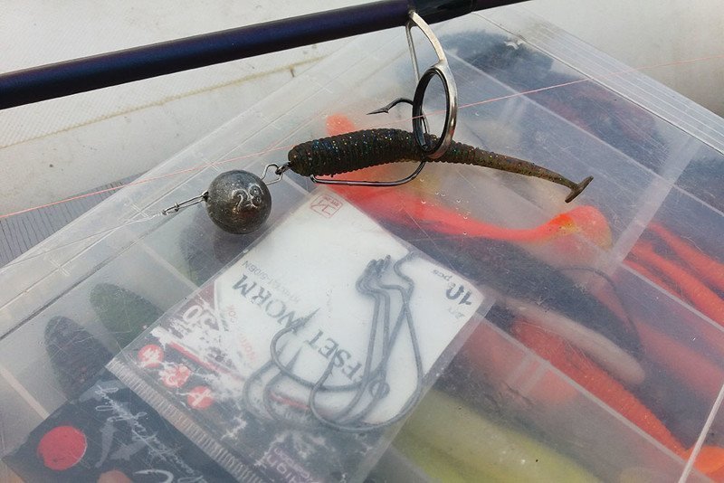 Однако, несмотря на это, сложностей с их монтажом я не испытывал. Вообще, офсет — это самый основной вариант оснастки, который я использовал. Чуть реже двойник — хоть приманка и не широкая, но за счет плотной структуры завести его можно вполне успешно. И никогда джиг-головку. Не потому что она для iShad Tail не подходит. Просто как-то я с ней пока сильно не сдружился.