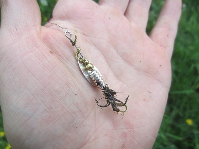 Что характерно, — у блесны оперённый тройник выполняет и привлекающую роль в проводке и парусит на падении. Он же немного притормаживает запуск вращения лепестка, поэтому запускать вращение лепестка надо несильной потяжкой. Были хватки щук — когда удачно забрасывал блесну в точечный участок и пока блесна ещё падала, размахивая блестящим лепестком.