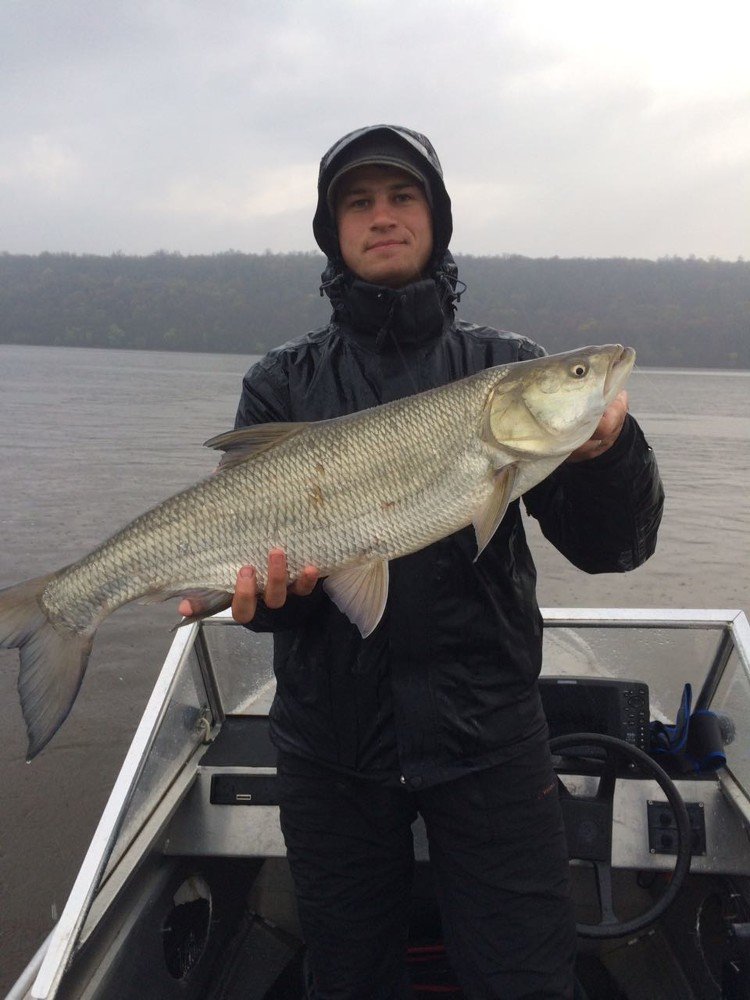 Экземпляры под стать времени, но хочется поймать своего трофейного. Очередной заброс, приманка бороздит толщу воды, и чувствуется, как жерех «подпинывает» блесну. Раз ткнулся! Два ткнулся! Делаю небольшую потяжку и даю паузу, и тут происходит поклевка, да такая, которую можно назвать «отдай спиннинг». Спиннинг начинает гасить рывки, жерех и впрямь трофейного размера. Через некоторое время получается взять его в лодку. Вот это то, что я так давно хотел — красавец ЖЕРЕХ!!!