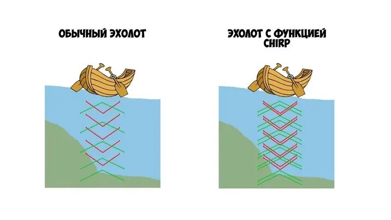 Помимо функции DownVu, эхолот имеет функцию Chirp, которая позволяет получить наиболее точную картинку с высоким разрешением, максимально снизить шумы. С этой функцией быстрее привыкаешь к эхолоту и понимаешь, что же находится под водой. Для того, чтобы вы поняли, чем же отличается обычный эхолот, от эхолота с функцией Chirp я нарисовал картинку, где поставил в сравнение два эхолота. Я думаю на ней всё просто и понятно. Более плотные лучи, которые передают более точную информацию — вот и весь смысл картинки.