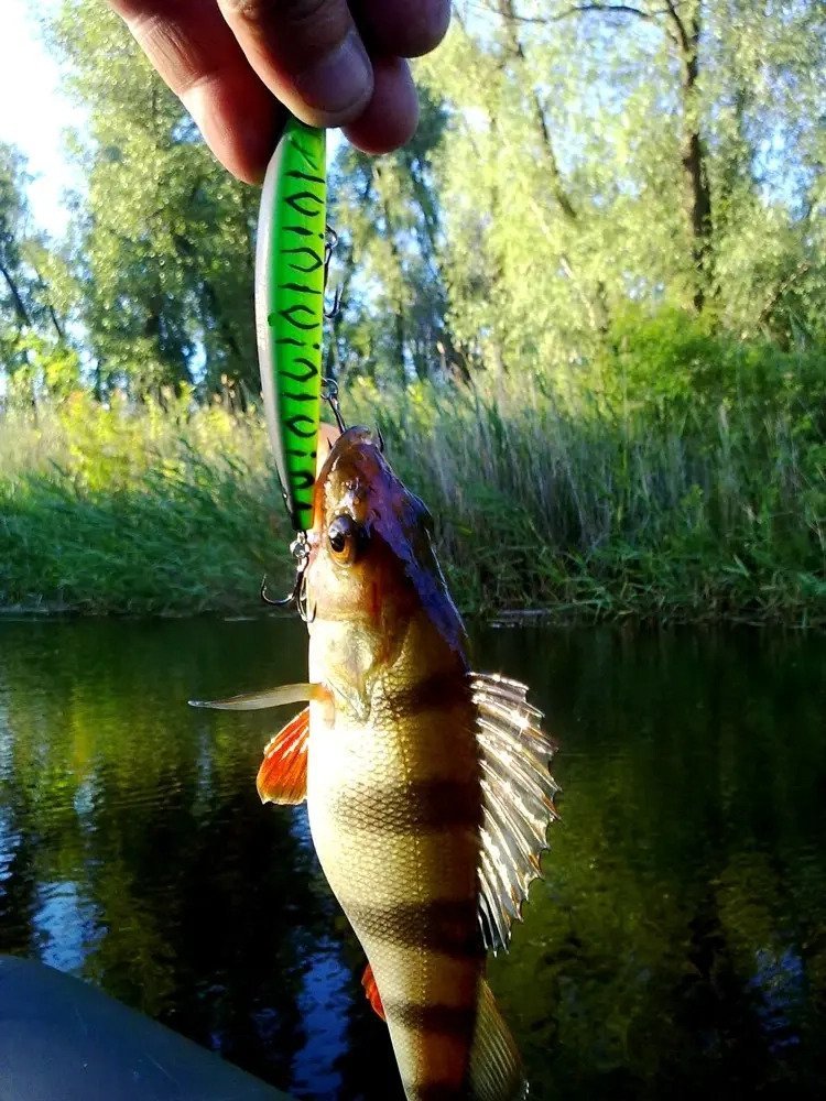 На этот раз, это маленький окунёк, длиной не более воблера. Уж его-то поймать я рассчитывал меньше всего. Но воблер своё дело знает!