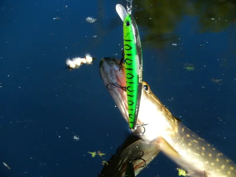 Воблерок цепко вцепился в маленького щурёнка всеми тремя тройниками.