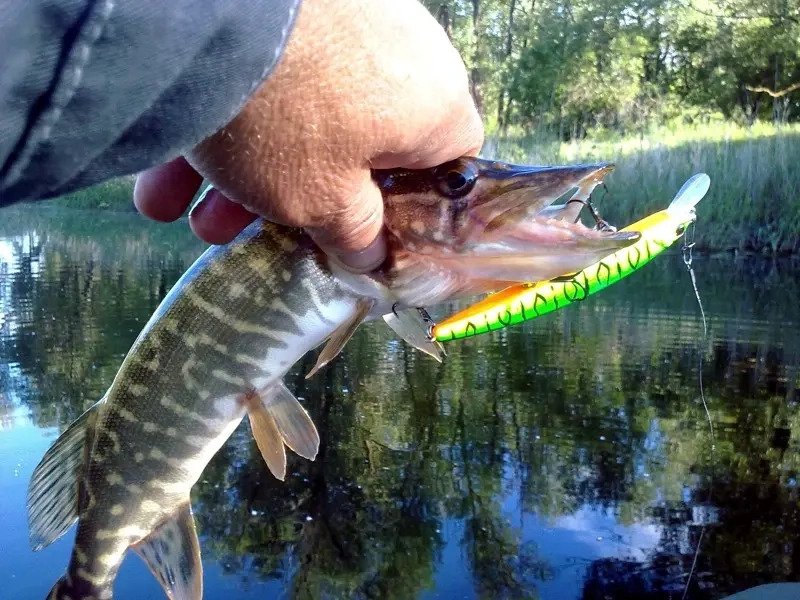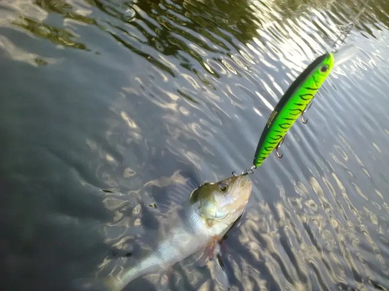 Воблер не сработал сегодня на равномерной проводке, но это ещё ничего не значит. За то время, которое я провёл сегодня на реке, я не заметил ни одного визуального признака присутствия хищника в реке. Не было разлетавшихся во все стороны веером мальков. Не было шараханья от лодки спугнутой щуки. Но всё равно, Montero 90SP умудрися выхватить щурёнка и двух окуньков.