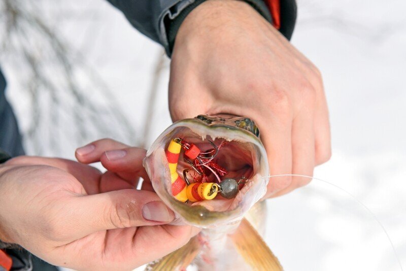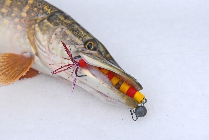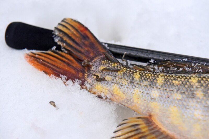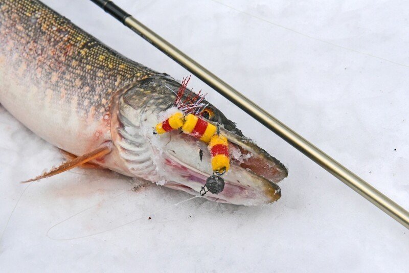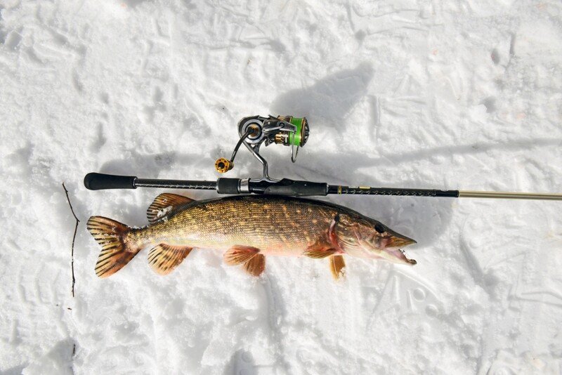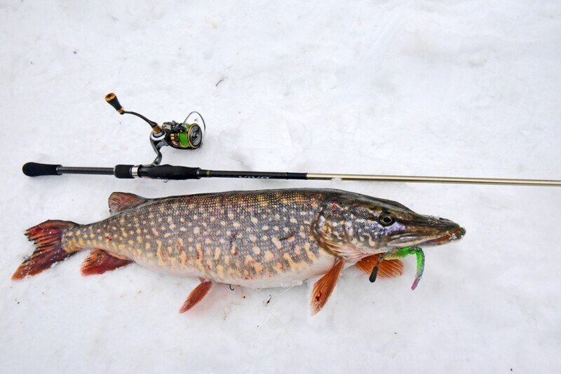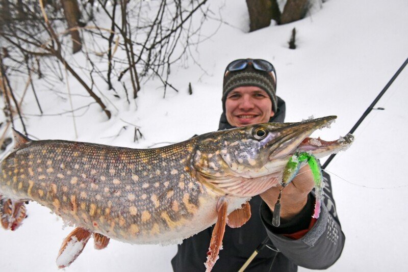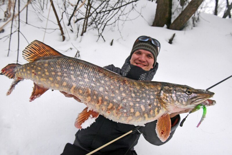 Время подходило к самому успешному, и я принялся в очередной раз по кругу менять приманки. Памятуя о недавнем успешном опыте ловли на поролоновую рыбку, поставил именно её, и на пятой проводке произошла поклевка дня! Фрикцион давно так не визжал, а спиннинг не сгибался под натиском сильной рыбы, но главная проблема оставалась впереди — как затащить её на лёд, соперник очень весомый, а кромка далеко и первые попытки успехом не увенчались… Хорошо, что отец был рядом и прихватил с собой деревянного помощника — длинную ветку, которой поддел щуку под брюхо и вдвоём мы все-таки смогли её затащить, а дальше на тоненького до победного! Ура!!!