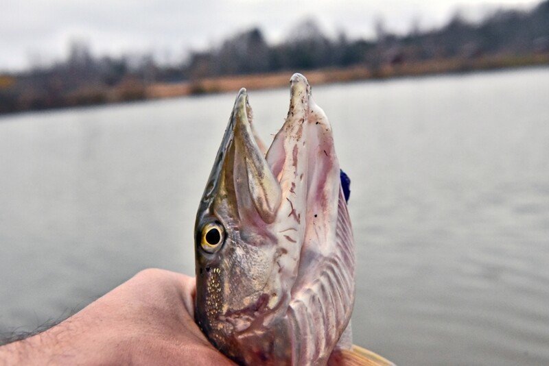 И прошел весь правый берег, обкидал каждый уголок, но, увы, результаты были плачевными. А вот отец параллельно напротив меня открыл счет поимкам и вскоре выловил вторую щучку уже в углу. Цветовые решения были аналогичны моим.