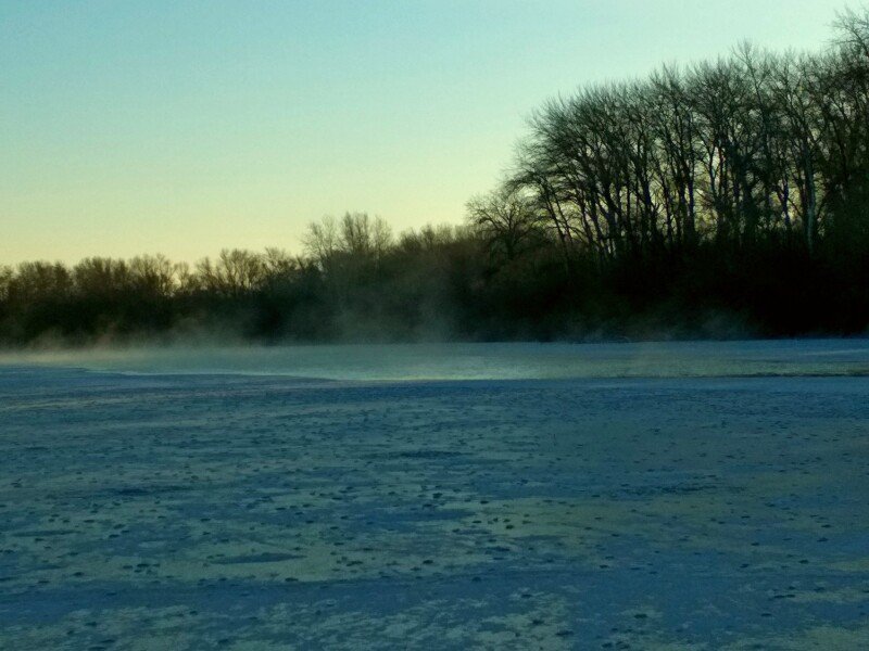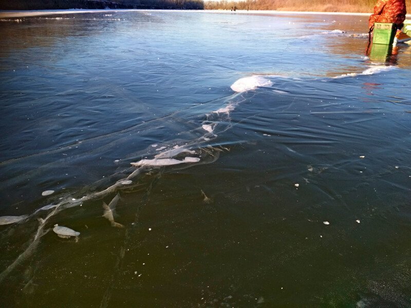 Наше уловистое место. Возле этой полыньи хорошо ловится крупная чехонь, попадается рыбец, белоглазка, густера, подлещик. А если повезёт, то можно поймать и судака. Правда, сейчас эта полынья почти полностью замёрзла.