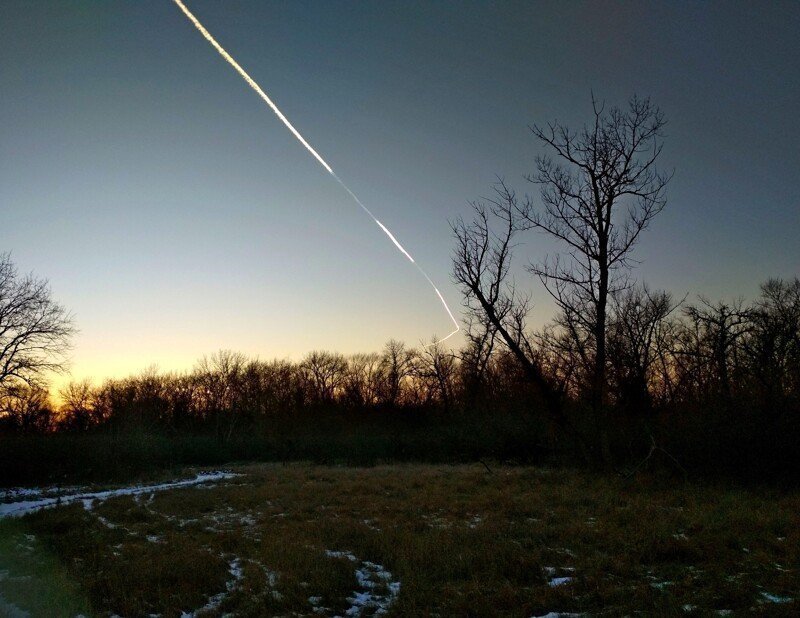 Что-то пролетело. Ребята сказали, что это след от ракеты. Сначала летело прямо, как будто кончалось топливо, потом повернула почти под прямым углом и пропала. Видимо, действительно — ракета, ведь для пассажирских самолётов небо у нас закрыто, они летают в обход.