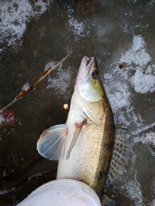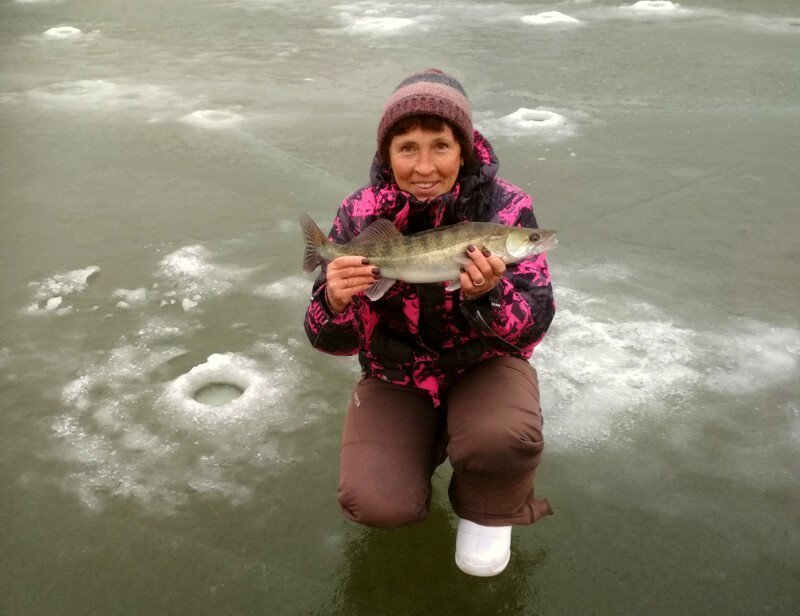 А это мой зимний судак. Когда подсекла, первое впечатление было, что поймала чехонь за хвост или пузо, настолько почувствовала сильное сопротивление. Было ощущение, что оборвётся леска. Потом поняла, что рыба встала поперёк лунки и будет проблема её вытащить. Пришлось воспользоваться веткой, с помощью которой я не сразу, но смогла направить рыбу в лунку. До последнего была уверена, что тяну крупную чехонь. Приятно была удивлена, когда в лунке показалась голова судака. Уверена, что мой возглас радости услышали все, кто был на льду, тем более в этот день только мне посчастливилось поймать судака.