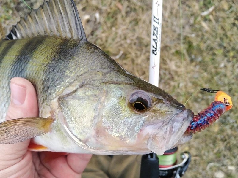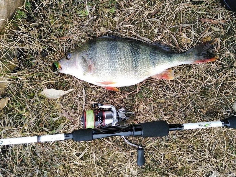 Понимая сущность предстоящей рыбалки, я заранее сделал основную ставку на микроджиг, захватив в качестве основного оружия обновлённый Norstream Blaze с тестом до 9 граммов. Но кто бы мог подумать, что на этот раз джиг проиграет воблерам! Да, пришлось пройти довольно большое расстояние без намёка на хоть каких-то подводных обитателей, но всё же скопление нехищной рыбы я нашёл. В то время как все работающие летом места ожидаемо бездействовали, рыба нашлась там, куда большинство рыболовов просто не дойдет пешком. Небольшой виброхвостик вместе с грузом в пять граммов, плавно опускаясь в небольшой приямок, наконец-то принёс и первую уверенную поклёвку полосатого разбойника. И весьма достойного! Но самое главное, что вместе с ним показалась и ещё парочка разбойников, сопроводив до берега своего коллегу. Вот тут-то и стоило задержаться подольше.