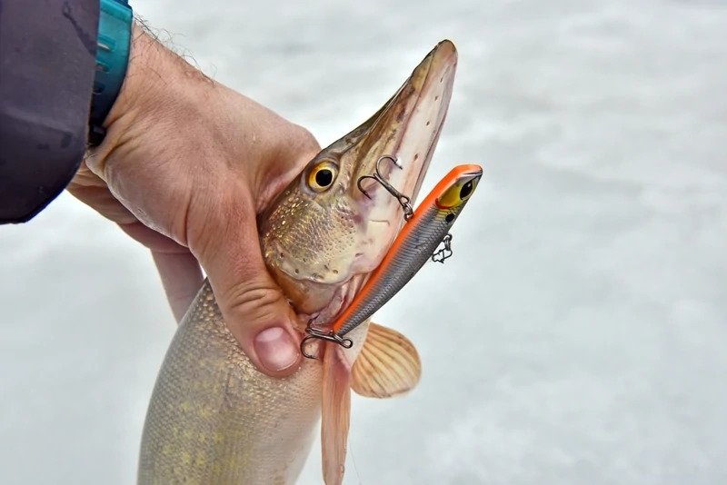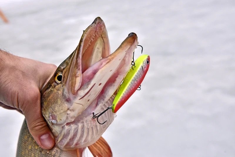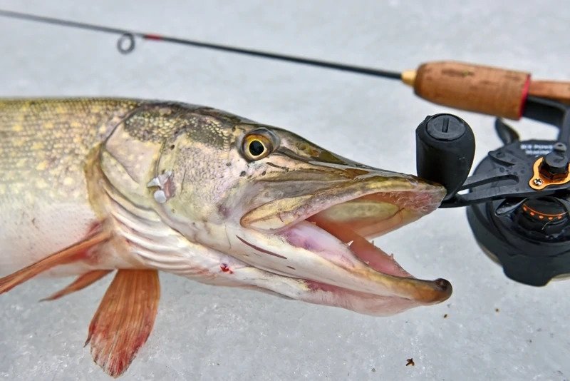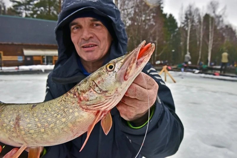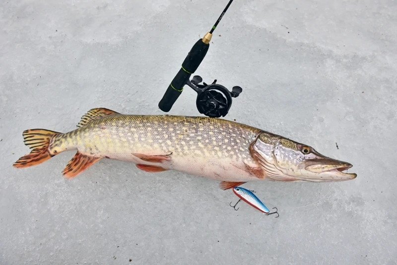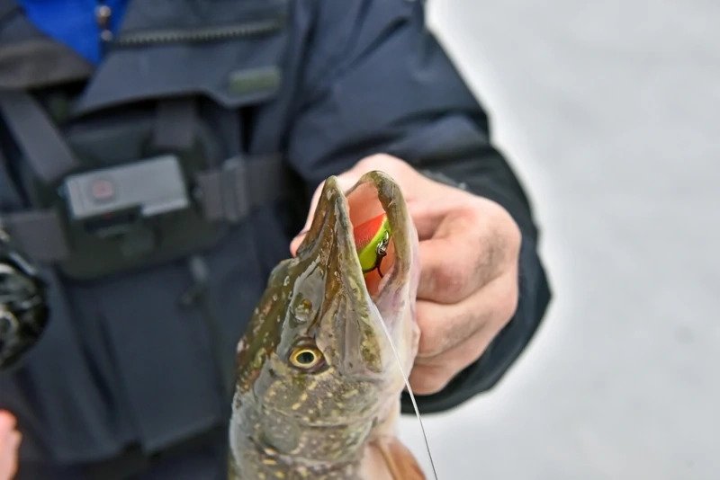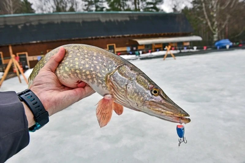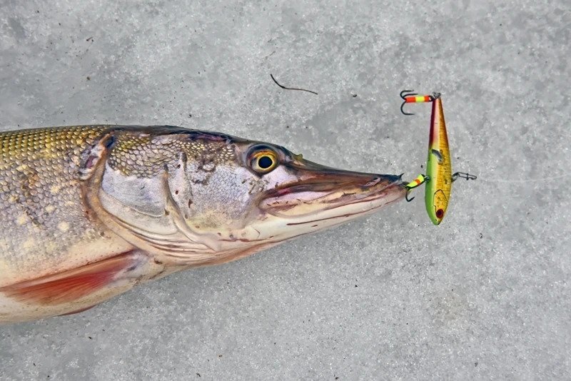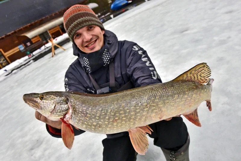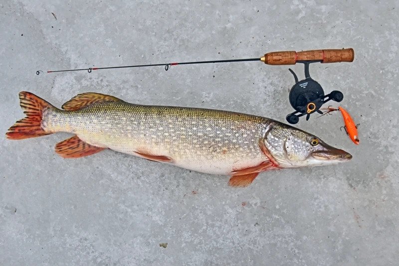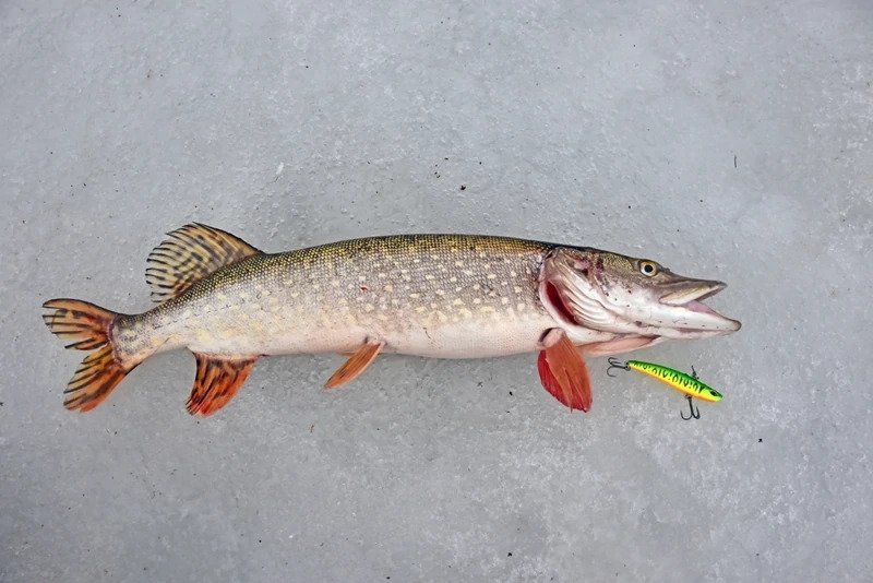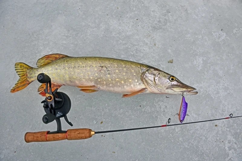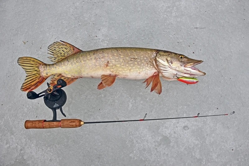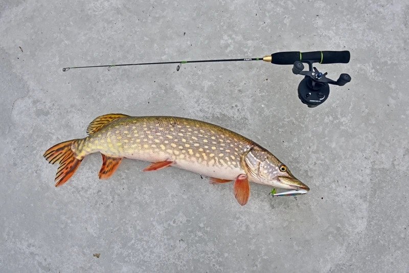 Батя решил пока остановиться на достигнутом и отправился ловить форель. Я же остался и решил сменить тактику — стальной поводок был заменен на флюрокарбоновый, и дело двинулось с мертвой точки. Причем, не просто двинулось, а как говорится «с места в карьер». Я поставил тот «кровавый» раттлин, и его скушала здоровенная щука, которая с трудом пролезла в лунку, я даже не сразу понял, как ее затаскивать наверх, поскольку опыт ловли хищника со льда имею куда меньше спиннингового.