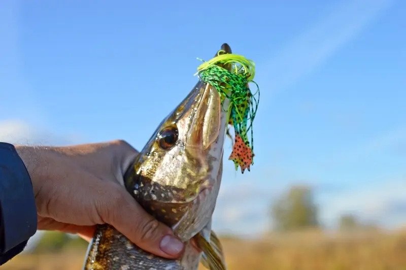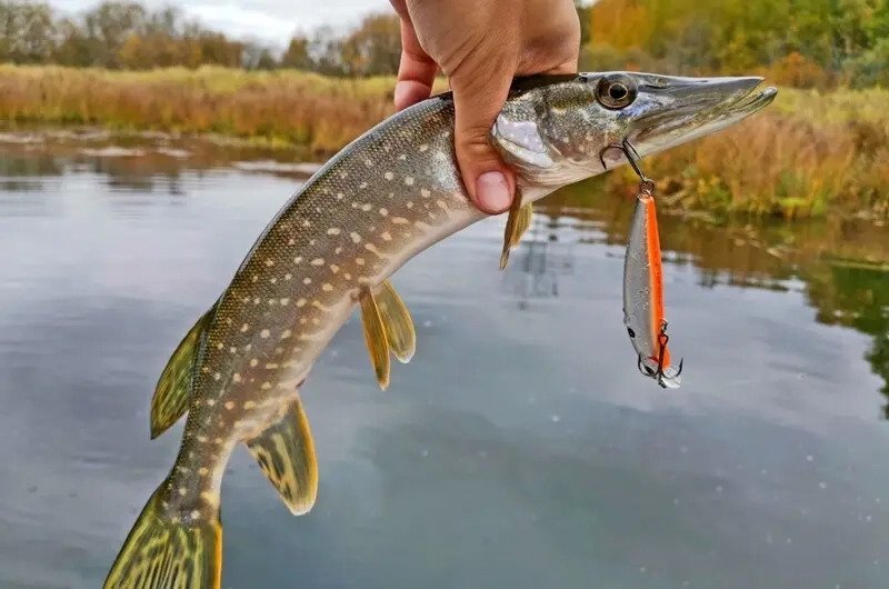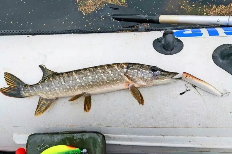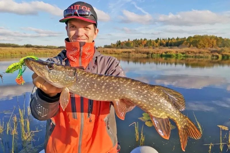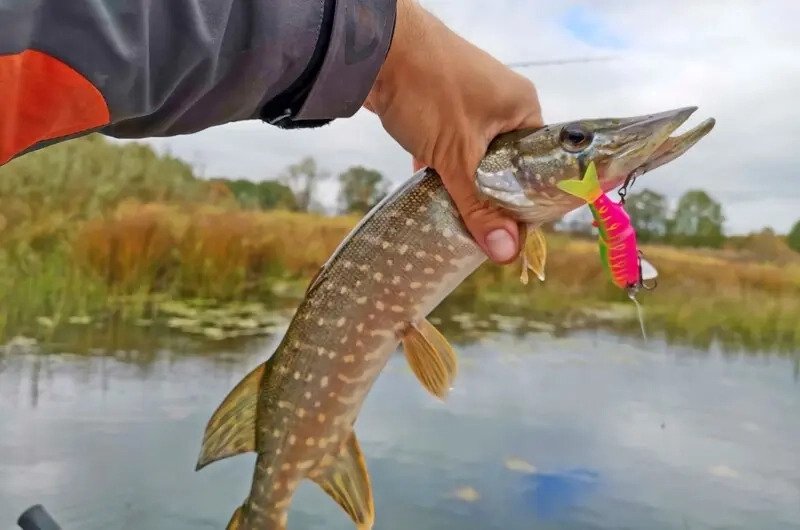 Там розовый цвет моего воблера сразу же привлек внимания второго щучьего малька. А потом я поставил любимую «Астраханскую» приманку и сразу же поймал еще двух представителей щучьего царства.