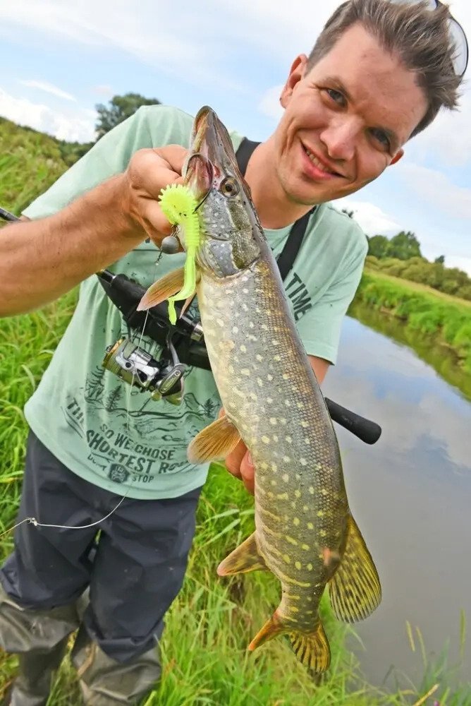 Я насадил ещё один B Fish, сделал техничный заброс ниже по течению и включил режим «ступеньки». Как только резину подхватил обратное течение и занесло под крутой берег — «бздынь» и тут я не мог налажать. На мгновение показалось, что там злобный крокодил, но размер был примерно такой же. Очень бодрая щука. С третьей попытки забросил её наверх, фух, есть!